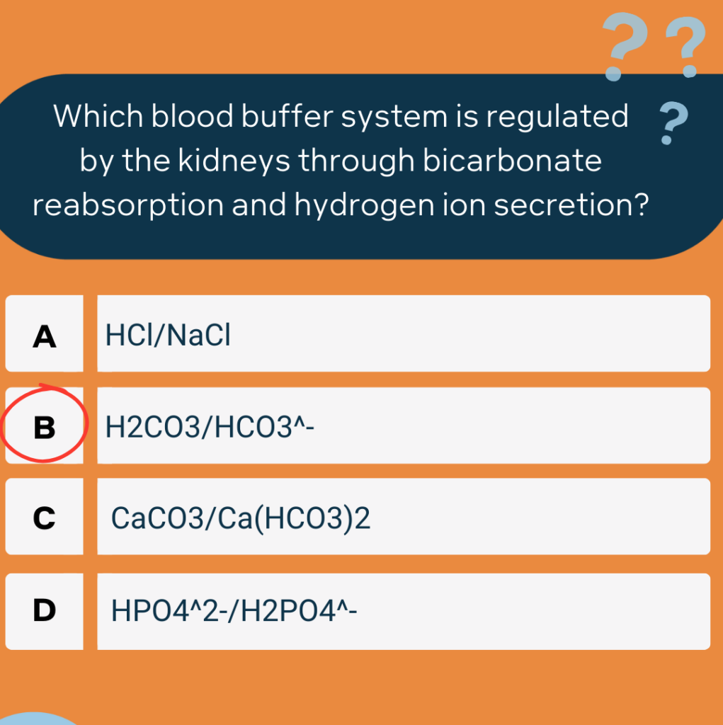 – HPO4^2-/H2PO4^- (D) is the phosphate buffer system, but it’s less significant in the context of renal regulation compared to the bicarbonate system.