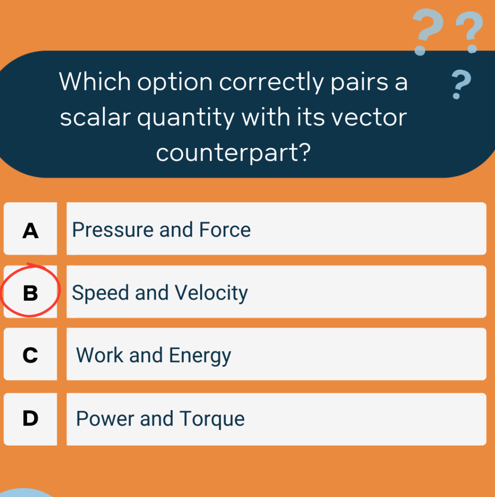 – B. Speed is a scalar quantity that measures how fast an object is moving, while Velocity is its vector counterpart, indicating both the speed and direction of the object’s motion.