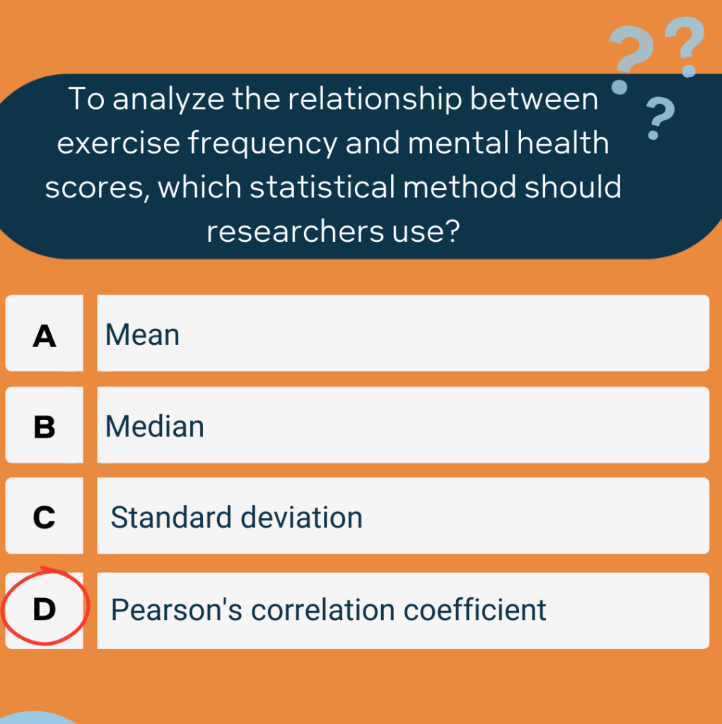 – Pearson’s correlation coefficient (D) is used to quantify the strength of the linear relationship between two variables. In this case, researchers need to understand the relationship between exercise frequency and mental health scores, making Pearson’s correlation coefficient the most appropriate statistical method